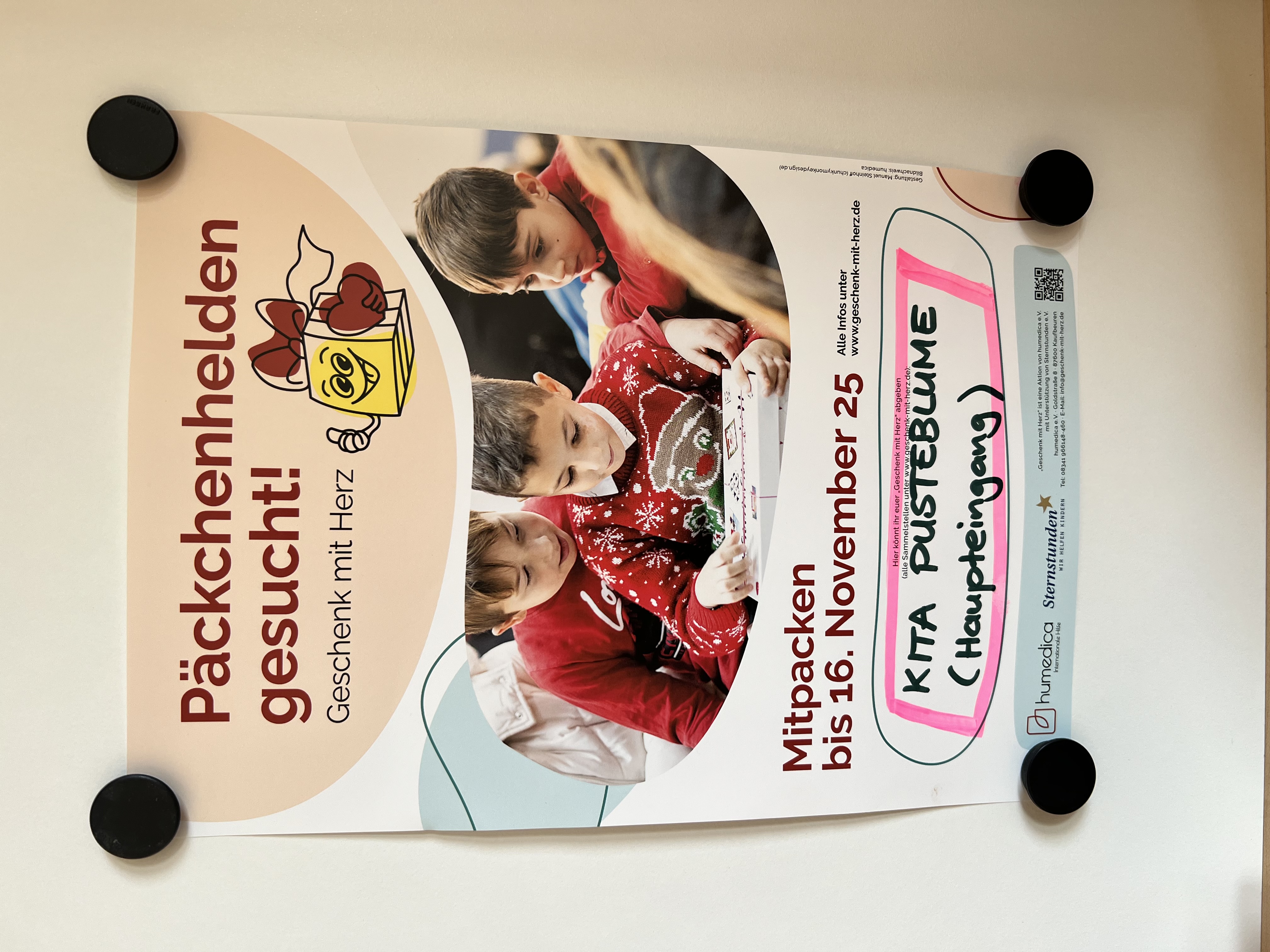 Wir werden auch in diesem Jahr an der Weihnachtspäckchen-Aktion „Geschenk mit Herz“ teilnehmen. Wir machen diese großartige Aktion zu unserer Herzensangelegenheit. Bitte packen auch Sie gemeinsam mit Ihrem Kind ein „Geschenk mit Herz“. Alle wichtigen Informationen gibt es auch im Internet auf der Aktionsseite www.geschenk-mit-herz.de. Damit Ihr Päckchen die Kinder rechtzeitig erreicht, legen Sie Ihr Geschenk bitte bis Freitag, 14.11.2025, im Eingangsbereich der Kita Pusteblume in Oberschneiding ab. Gemeinsam mit vielen weiteren KiTas, Schulen und anderen Einrichtungen in Bayern, werden wir in diesem...